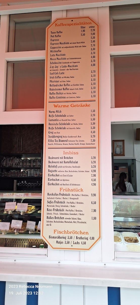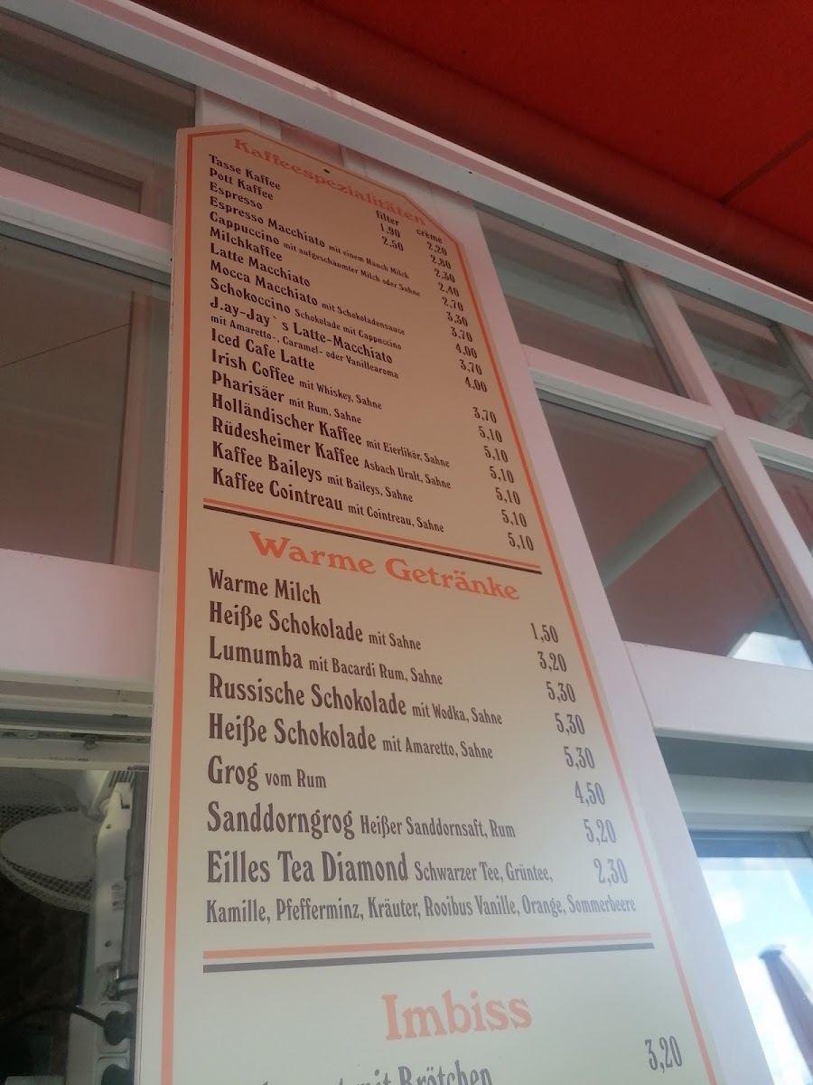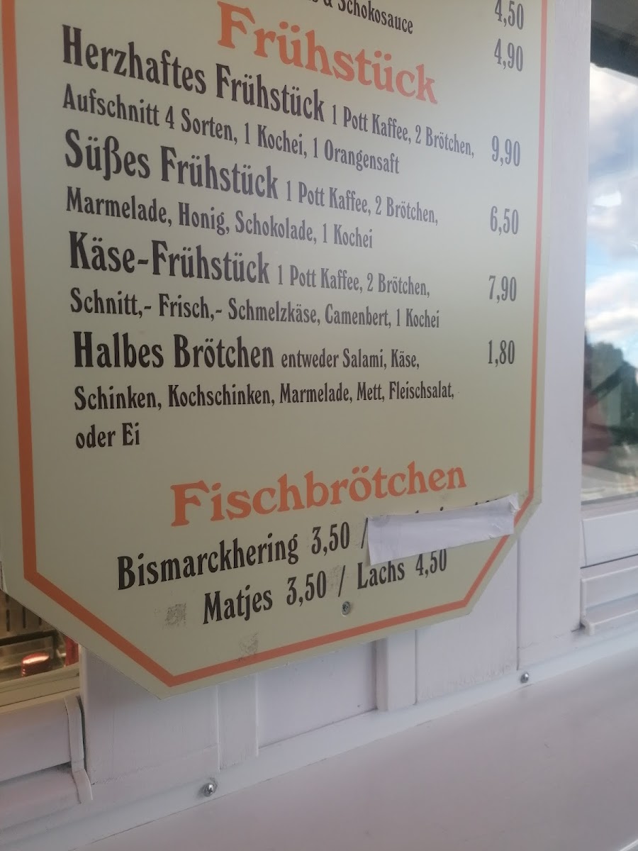 Food offerings include light bites and small meals, with options such as belegte Brötchen (filled bread rolls) and fish-based snacks exemplified by regional fish dishes. The dessert selection includes traditional cakes and pastries, for instance Streuselkuchen and Kirschstreuselkuchen, providing sweet complements to the beverage choices.