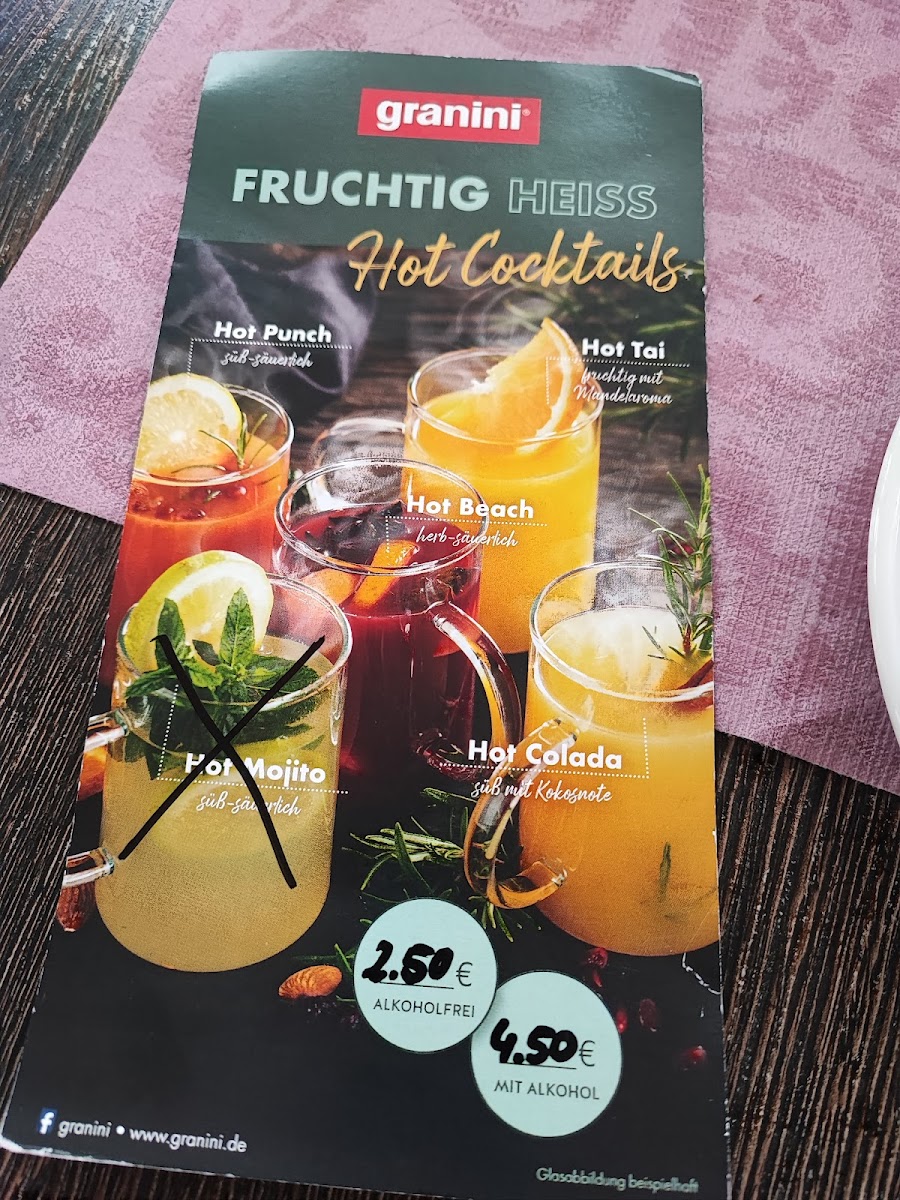 The menu features a selection of beverages and light food items suitable for different times of the day, including breakfast, coffee breaks, and casual snacks. Visitors can find various hot and cold drinks such as coffee specialties like Latte Macchiato and Filterkaffee, as well as alcoholic options including beer and cocktails like the Mai Tai.